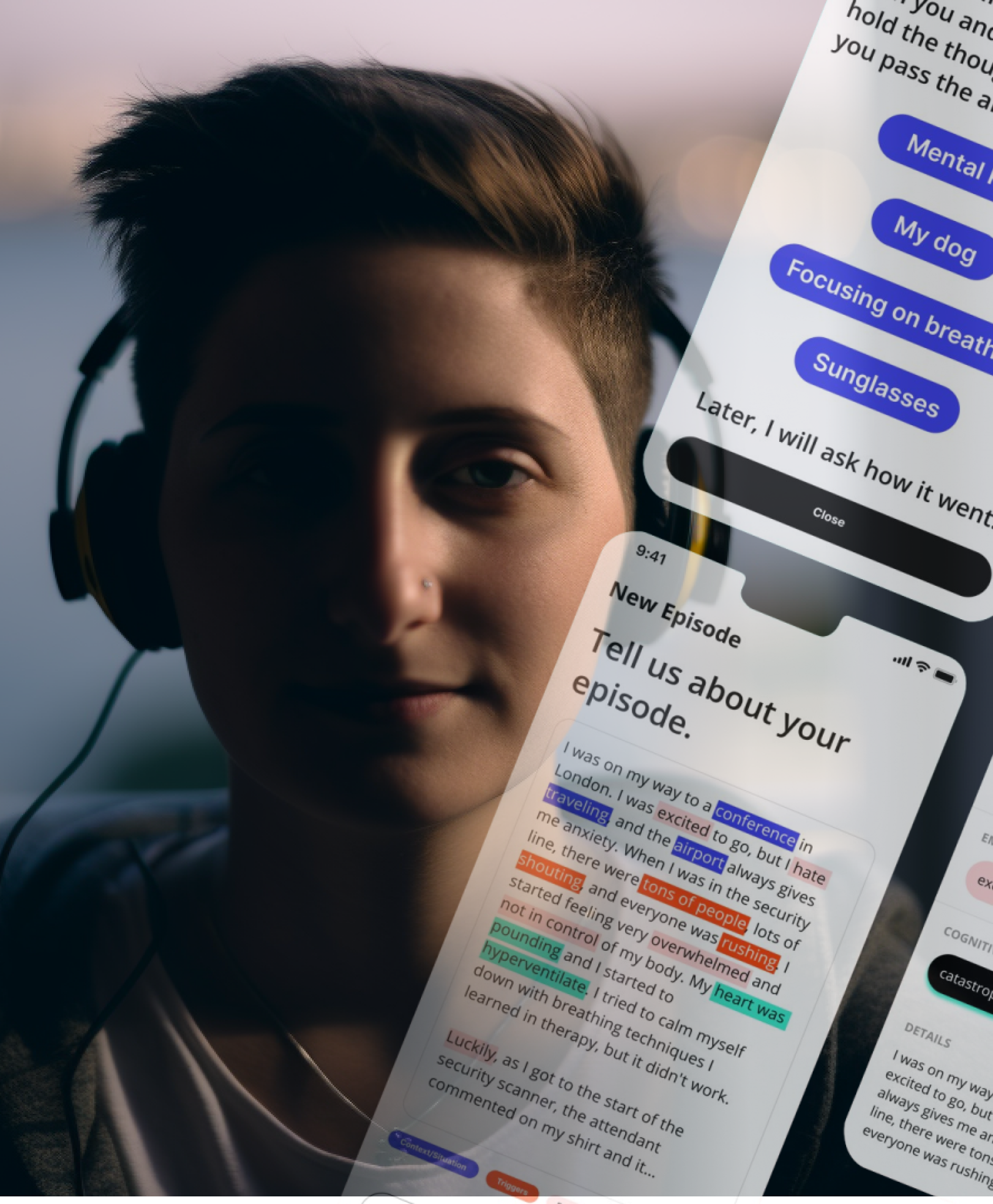 We chose to present the final concept to the Mental Pin team by telling the story of Emily, a fictional persona based on the demographics of our interviewees and Mental Pin's current user base.Emily's journey with Mental Pin begins when she purchases her device and downloads the app after hearing an advertisement on a podcast. A few days later, while Emily is at the airport on her way to London, she has a panic attack that triggers her anxiety. After using her Mental Pin device to keep her anxiety from spiraling out of control, the Mental Pin app offers Emily a helpful aftermath exercise to provide further support.The next day, Emily is encouraged to share details of her recent episode in the Mental Pin app. The automated annotation feature utilizes AI to run sentiment analysis on Emily's voice entry, highlighting the triggers, emotions, and physical changes that occurred during her episode. She can also compare this episode to others and start to understand actionable patterns about her mental health.