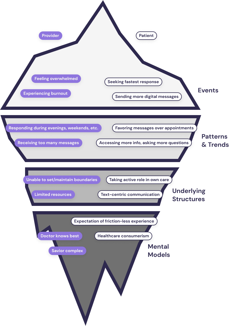 With the scope of the challenge now encompassing technical, behavioral, and cultural aspects of patient portal use, the ideation process began by contextualizing the patient-provider relationship using a systems thinking framework called the Iceberg Model.The goal was to identify potential leverage points at the Underlying Structure and Mental Models levels that could have a greater impact on behavioral and systemic transformation.Throughout the ideation and concept development process, the principle of "boundaries over barriers" was a constant driving force. This ensured that any proposed solutions would strike a balance between healthy boundaries for providers, while not acting as a restrictive barrier to access or care for patients.