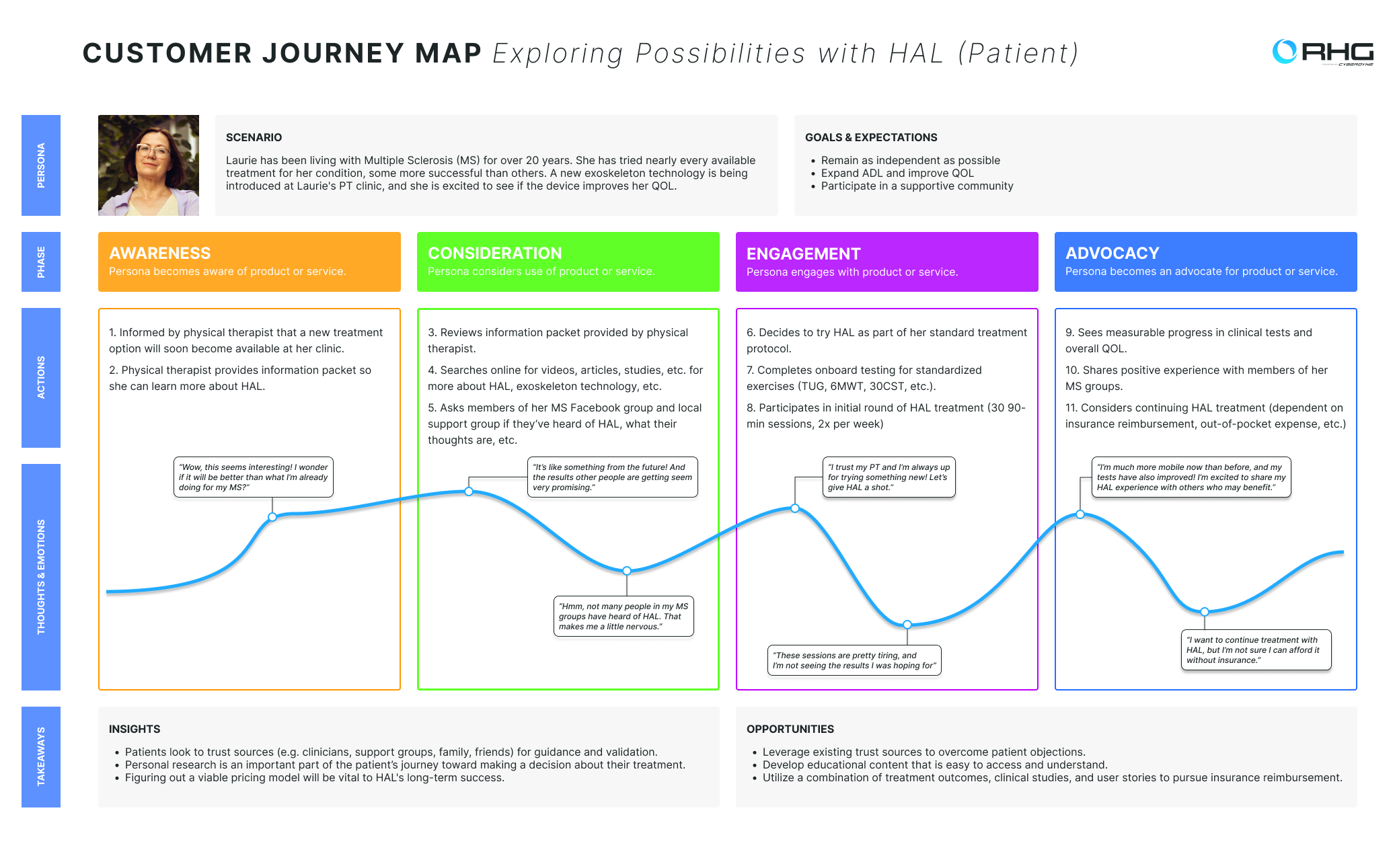 The feedback and insights gathered were used to build detailed personas, customer journey maps, and engaging content detailing the HAL experience from the patient's point of view. The motivations and goals of the RHG team were also integrated into the narrative in order to create a complete picture of what HAL therapy with RISE Healthcare Group is really like.These assets have been valuable tools in communication with potential patients, their families, and community organizations.